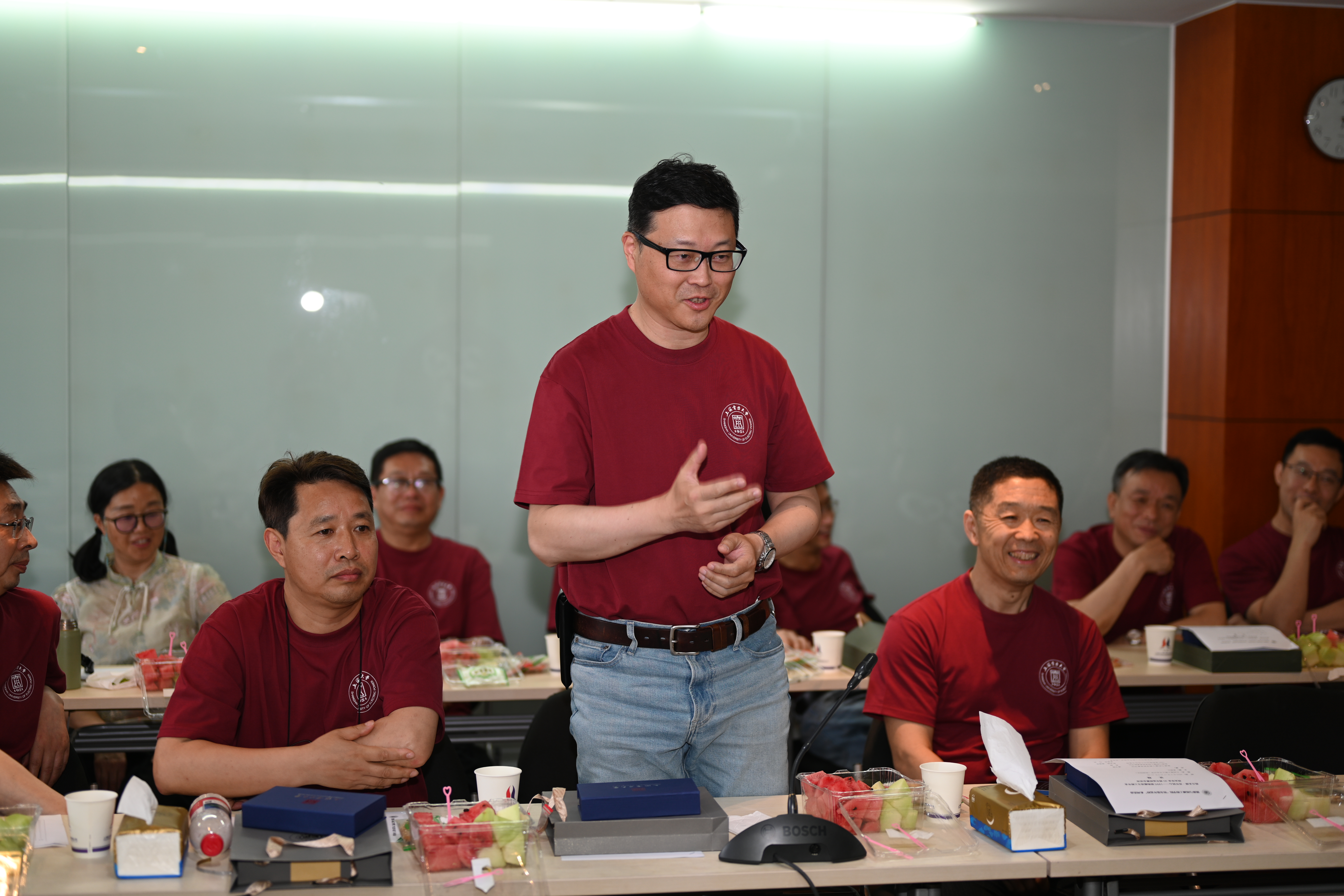 活动现场,校友们逐一分享个人近况与行业成就,从新能源研发到海外技术合作,未到场的校友通过腾讯会议“云端”畅叙,大家也共同表达了对母校和恩师的感激之情。马庆、陈金娥和章德龙三位恩师深情寄语,对校友们的成长和发展表示欣慰,对大家未来的发展予以期待,勉励校友们在各自的领域继续发光发热。同时,老师们也殷殷嘱咐校友们在事业发展的同时兼顾身心健康、家庭幸福,期待校友们经常回母校看看。现场特别准备的校徽主题蛋糕将温情推向高潮,潘卫国以“热力精神永续”寄语校友与母校同心同行,期待携手书写绿色能源新篇章。