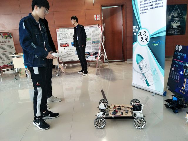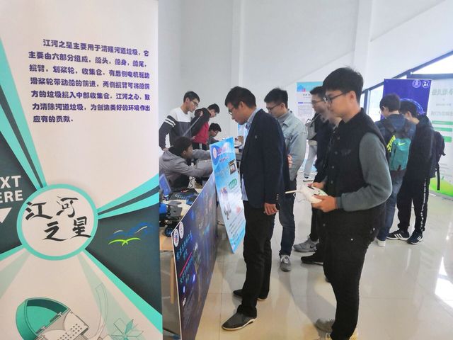 随后各学院进行科技创新成果展示,356体育在线官网所展示的,麦克纳姆轮小车引得在场学生驻足,河道清理型机械模型“江河之心”更引来学生的围观讨论,大学生创新创业协会副会长马泽细致的介绍两项作品的原理及用途。周长长老师莅临现场,与参加本次活动的上海市创造杯二等奖的获奖队伍进行深入交流,视频短片与动手体验相结合,周老师对本次展出作品给予了高度评价,对我们善于创新、乐于创造的同学给予了鼓励和并寄予厚望,希望我们能机学子在各项赛事中都能斩获更多佳绩,取得更大成功!