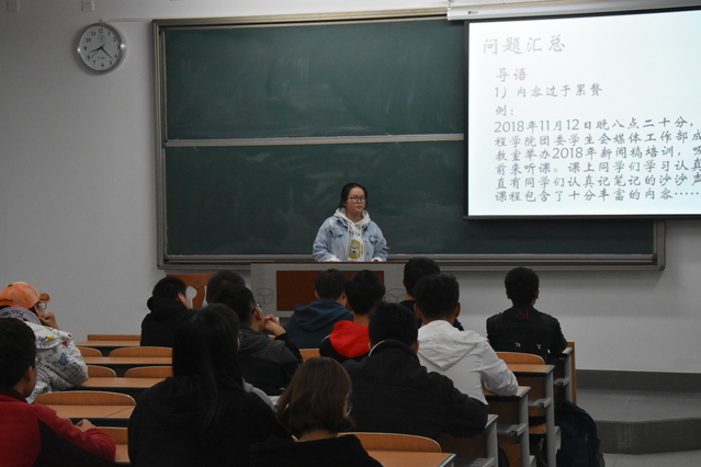 2018年11月20日星期二晚上8:20,356体育在线官网新闻稿培训第二讲在三教210成功举行。此次培训由媒体工作部副部长周盈辛主讲,各班宣传委员及各部门干事参与了培训。