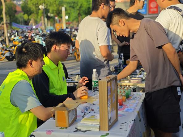 活动现场特别设置露天驻唱舞台,邀请毕业班学生张茂、张础岩、张亮及院十佳歌手张祉言倾情献唱。《一路向北》《凤凰花开的路口》《同桌的你》《那些年》《入海》等经典校园歌曲引发全场共鸣,摊位暖黄的串灯与往来人影交织成画,婉转歌声中,有人低声跟唱,有人举灯轻晃,点点光影摇曳如星河倾泻。更有即兴加入的“观众点歌”环节,泰国留学四姐妹以一首《Body Shaming》唱出“打破偏见,拥抱自我”的宣言,掀起一场关于自信与勇气的声浪,将夏夜的热烈氛围推向高潮。