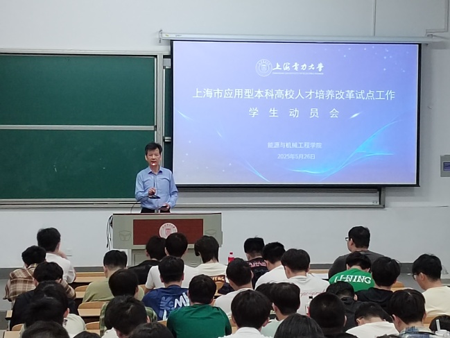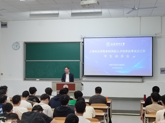2025年5月26日18:00,356体育在线官网在临港校区二教106教室召开上海市应用型本科高校人才培养改革试点工作学生动员会。本次会议面向新能源科学与工程、储能科学与工程专业大一至大三全体在校本科生,旨在深入解读改革政策、凝聚共识,推动高素质应用型人才培养。356体育在线官网党委书记潘卫国、院长朱群志、副院长仇中柱、新能源工程系副主任姜未汀、储能科学与工程教研室主任闫霆出席会议。会议由学院党委副书记周婷主持。
