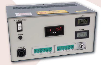 正面面板设置有12个热电偶插槽(K型热电偶),3个电子显示屏等,测量参数包括温度、电压(0~240V)、电流(0~2A)