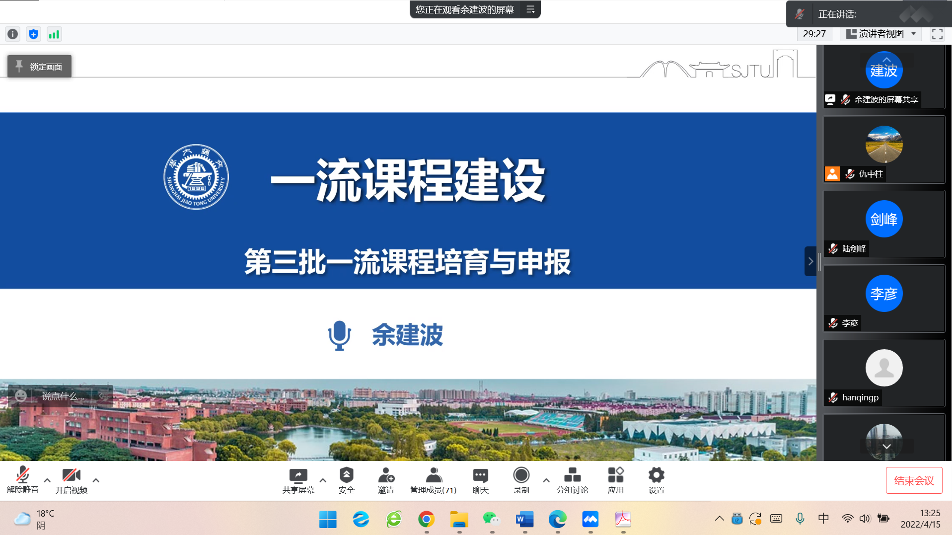 2022年4月15日下午,356体育在线官网线上召开课程建设专题会,会上特邀上海交通大学教务处在线课程建设负责人余建波老师做了“一流课程建设”线上专家报告。356体育在线官网全体教师参加了专题会,会议由仇中柱副院长主持。