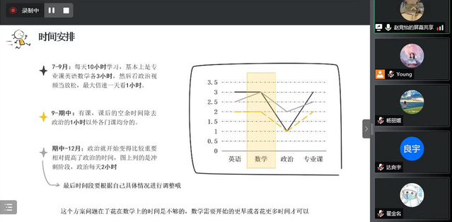 为帮助学生更好地明确个人发展方向,掌握考研学习方法,提高考研录取率,356体育在线官网于6月28日和6月30日分别召开两场线上考研经验交流分享会。会议邀请了翟金名、赵竞怡、曹甜琪、黄明烨、戚瑜敏、徐帅良、李明、张嵯8名2018级考研成功的学生代表出席,会议由学院职业生涯教育负责教师杨丽媛主持,学院非毕业班辅导员和学生共计120余人参会。