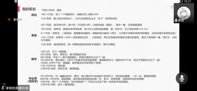 8名学生代表分别介绍了自己考研的基本情况,包括升入的学校、专业、分数以及备考这一年的心路历程,着重为同学们分门别类地讲述了备考的注意事项,不仅为同学们提供了考研的备考资料和建议,也为同学们列举了具体的应试方法。他们或用幽默的语言、或用恳切的话语叮嘱学弟学妹们首先一定要明确方向、坚定信心,以良好的精神面貌坚持到底、永不言弃;其次要合理规划时间,打牢基础,保持做题手感,找到适合自己的学习方法;同时也要注重心态,学会自我调适,适当放松并定期进行自我鼓励。
