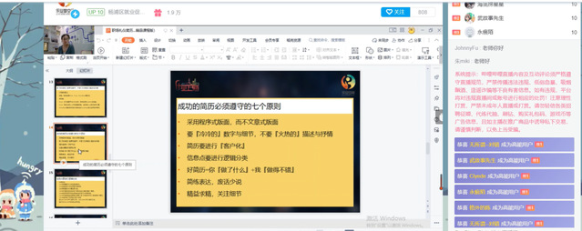 为切实提升学生就业能力和职场竞争力,帮助学生实现更高质量就业,356体育在线官网于2022年9月13日通过Bilibili直播间组织开展主题为“简历在手,职达未来”的线上简历制作技巧专题讲座,讲座由杨浦区就业促进中心专家陈燕进行讲授,2019级学生进入直播间观看交流。