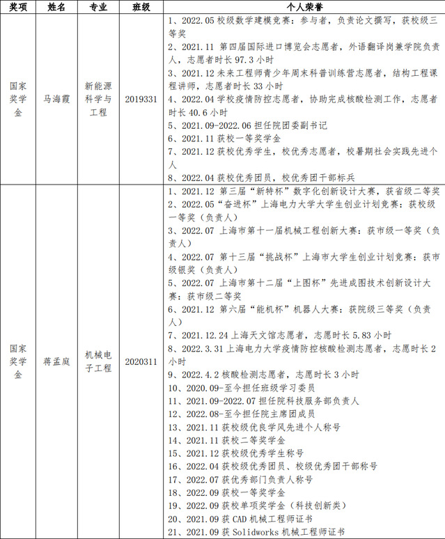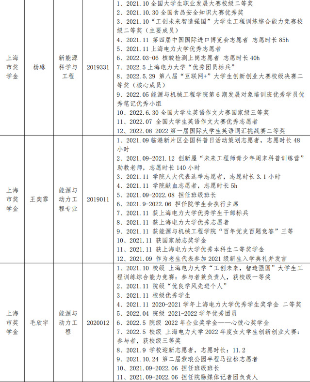 国家奖学金、上海市奖学金推荐结果