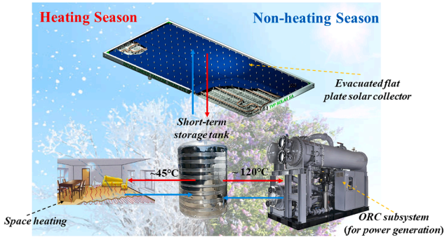 针对太阳能光热输出在非采暖季存在大量季节性太阳能资源浪费的现象。第二篇论文提出了两种太阳能季节调节能源系统,即太阳能光热和光伏集成以及太阳能光热与有机朗肯循环集成。两种系统都可以实现在采暖季节调节太阳能用于建筑采暖,在非采暖季节充分利用太阳能的季节性余能用于发电。