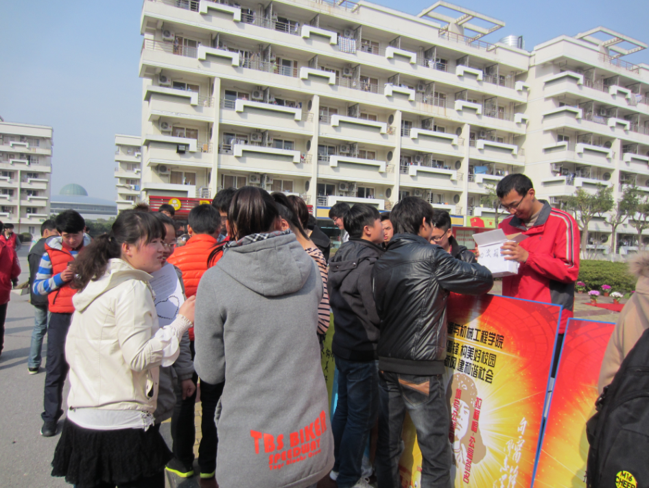 在学校“雷锋精神电娃行”志愿活动启动仪式上,356体育在线官网有两项志愿活动获得立项,分别是“传扬雷锋精神,电娃支援血站-356体育在线官网南汇血站志愿活动”和“电娃学雷锋,服务古钟园-356体育在线官网古钟园志愿活动”。随后,356体育在线官网大学生志愿者协会以“学雷锋,构美好校园;树新风,建和谐社会”为主题,在国旗广场上举行志愿服务活动。活动包括为同学服务以及公益宣传环节,包括修自行车、手工缝补、发放雷锋胸章、公益签名以及呼吁同学们留下对于社会的美好愿望等。同时设置了大众抽奖环节,旨在吸引更多同学的加入,最大限度发挥宣传和服务的作用。