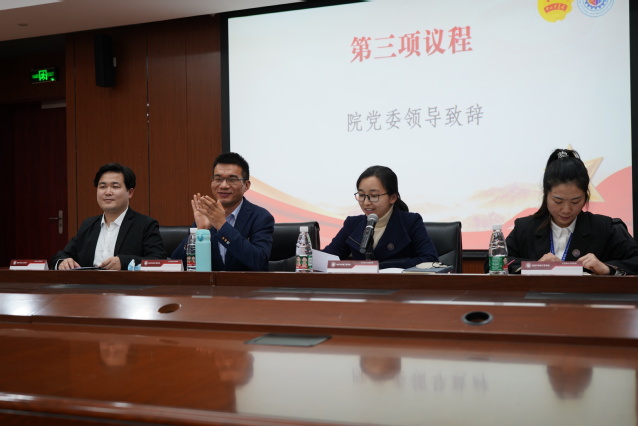 周婷代表学院党委向大会致辞,她向全院青年学生发出号召:作为新一代的青年,要坚定共产主义信念,高扬爱国主义旗帜,努力做社会主义核心价值观的践行者,做共青团事业的建设者;要将自己的奋斗与祖国的前途、人民的事业紧密相连,赢得永恒的青春;要争先创优、勇当先锋,全面提高政治素质和思想道德水平,树立为中华民族伟大复习而努力奋斗的远大理想。她对学生会工作提出期望:青年工作是党的事业的重要组成部分和重要基础,院学生会要自觉把自己置于党的领导之下,引导广大青年学生听党话、跟党走,坚定正确的政治方向,激发广大青年学生为实现中国梦接续奋斗的动能;加强自身建设,围绕学校中心工作,起好桥梁纽带作用,团结带领广大青年学生,为学院建设凝聚青春力量!