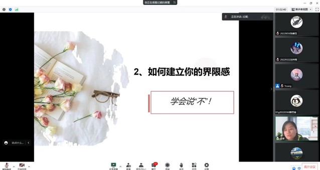 “你是社恐还是社牛?” 过爱老师通过网络流行语“社牛”和“社恐”的对比开场,引发同学们的兴趣,同学们带着思考,开启了此次学习之旅。和谐的人际关系是一种人际交往的润滑剂,有利于人与人之间和谐、友好的相处,也有利于个人和集体的健康发展。讲座中过爱老师为同学们介绍了刺猬理论,强调在人际沟通中,亲近感和界限感同样重要,人与人之间是一种“我为人人、人人为我”的交往。