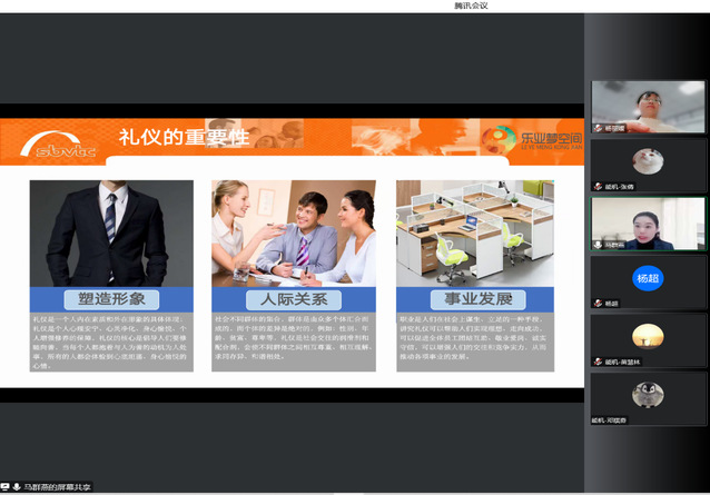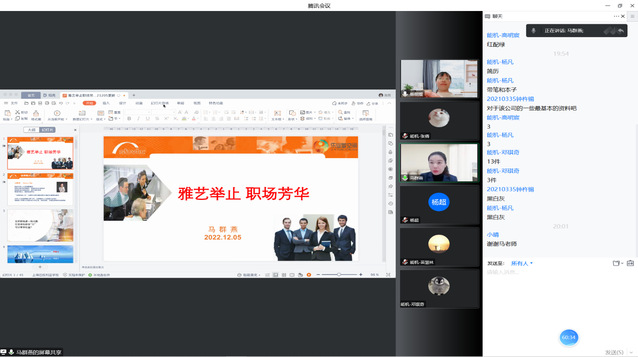 为加强同学们就业技能技巧,提高就业竞争力,为步入职场、步入社会打下良好基础,356体育在线官网于2022年12月5日晚19:00在线上开展了主题为“专家同行 聚力暖冬—雅艺举止、职场芳华”的职场礼仪培训讲座。本次讲座邀请了高级人力资源管理师马群燕作为主讲人,为同学们悉心讲解了礼仪与习惯,气质和仪态,会面与商务,沟通与谈吐。