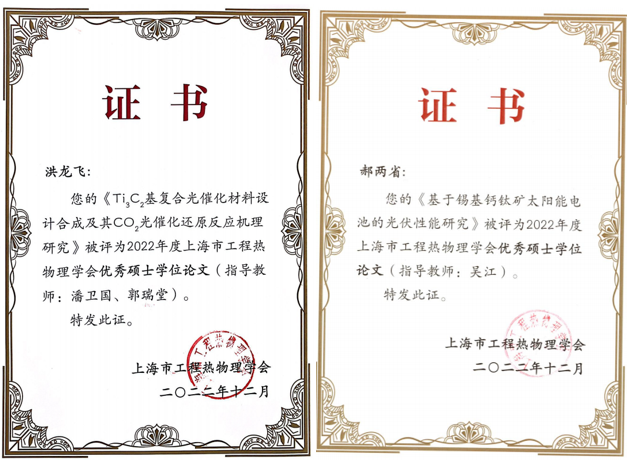 3月11日,上海市工程热物理学会2022学术年会暨第九届理事工作会议在我校杨浦校区小礼堂召开。会议颁发了2022年度上海市工程热物理学会优秀博士学位论文奖和优秀硕士学位论文奖,我校356体育在线官网潘卫国教授和郭瑞堂教授指导研究生洪龙飞完成的硕士学位论文《Ti3C2基复合光催化材料设计合成及其CO2光催化还原反应机理研究》、吴江教授指导研究生郝两省完成的硕士学位论文《基于锡基钙钛矿太阳能电池的光伏性能研究》,荣获优秀硕士学位论文奖。