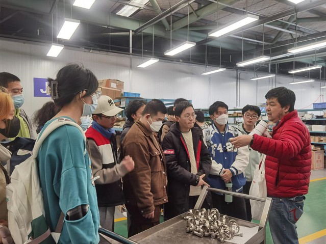 随后,同学们前往一线生产厂区进行参观。车间内物品摆放规范、干净整洁,内部的加工区、设备区、清洁区等划分明确、井然有序。身临其境,同学们在洁净明亮的车间近距离感受每一环节的严格把控。小小的一个仪表盘从生产车间到安装上机,通常要经过注塑、吸塑、切割、 装配等诸多工艺环节。移步于各个车间中,认真工作的工程师与工人师傅们也深深吸引了同学们,他们的专业素养、熟练操作令同学们赞叹不已。部分同学就一些仪器的使用原理及产品细节提问,王主任深入浅出,一一耐心回答。不知不觉地,工人师傅的匠心工艺与一丝不苟的精神就在这一问一答、一进一出中深深感染着同学们。