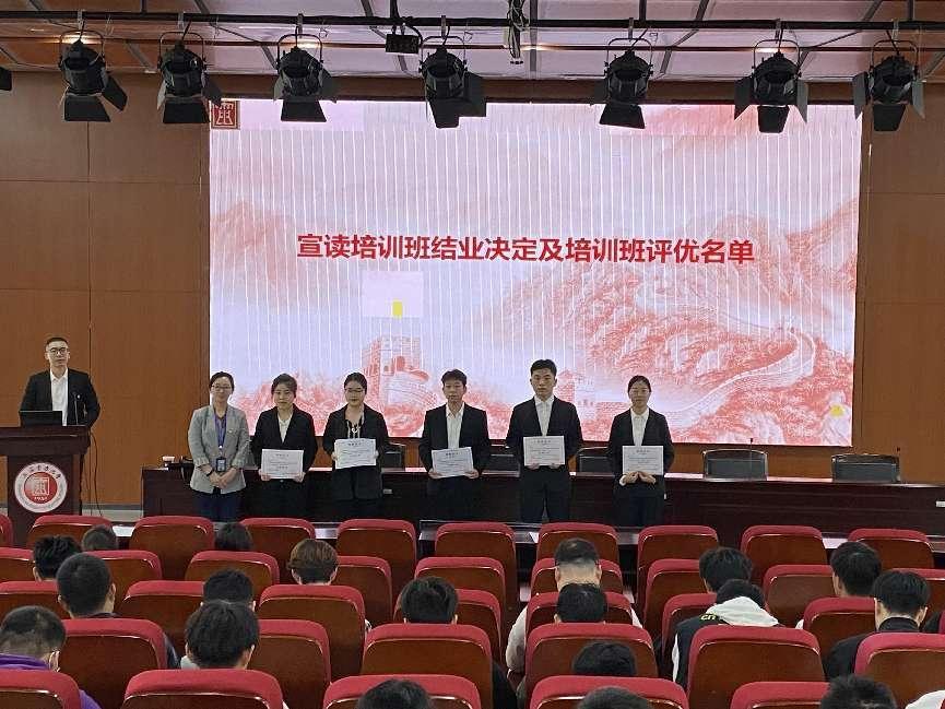 王喆同志对本次培训班进行了回顾展示,此次培训班自3月3日开班,至4月4日考试结束,为期一个月的培训中,党校制订了科学周密的教学计划,既有理论学习,又有小组研讨,并安排外出学习参观和实践活动。本次培训班共结业104名学员,学院党委根据党校评优要求,评选出“优秀小组”、“优秀学员”、“优秀笔记”若干,周婷同志为其颁发了荣誉证书。