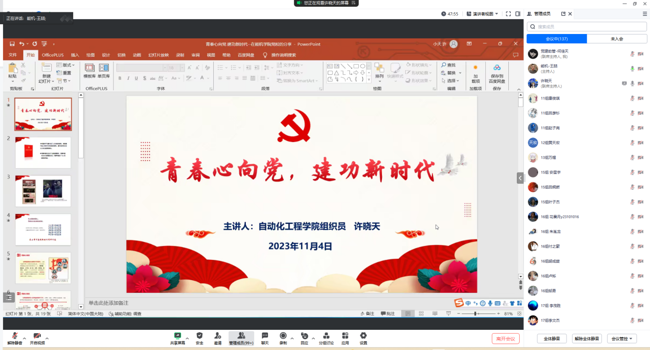 2023年11月4日,356体育在线官网分党校开展第5期初级党校培训班第三讲。本次授课由自动化学院组织员许晓天老师主讲,开展了以“青春心向党,建功新时代”为主题的党课培训。会议由356体育在线官网组织员王喆老师主持。