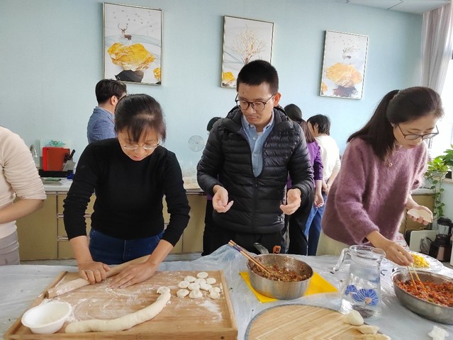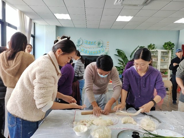一大早,老师们就聚集在温馨美好的教工之家里,在大家的欢声笑语中,356体育在线官网一年一度的包饺子活动火热展开。今年的所有饺子馅都是现做现调,芹菜猪肉、羊肉大葱、胡萝卜鸡蛋、韭菜虾仁等,丰富多样,远远闻着就香味扑鼻。现场活动中,各位老师分工合作,互帮互教,有的擀皮、有的揪面团、有的包馅儿,各显身手。短短的时间里,一排排独具个性的饺子很快就摆满了一个个餐盘,大家体验着协作的乐趣,感受着冬日的温情。