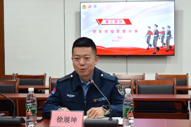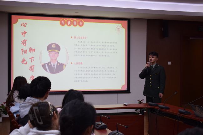 随后,我校优秀退役大学生士兵曹永富分享了自己精彩的军旅故事和返校经历。曹永富从入伍初心讲起,怀揣着对祖国的热爱和对军人的崇敬,毅然投身军营。在部队经历中,艰苦的训练、严格的纪律以及与战友们共同奋斗的日子,让他印象难忘。这些经历不仅锻炼了他的身体,更磨砺了他的意志。回到校园后,曹永富在学习经历、社团活动和创业能力等方面也有着丰富的收获。面对充满无限可能的人生,他鼓励同学们要勇敢尝试,他用自己真实的故事和真诚的话语深深打动了在场的每一位同学,让大家对军旅生活充满了向往。