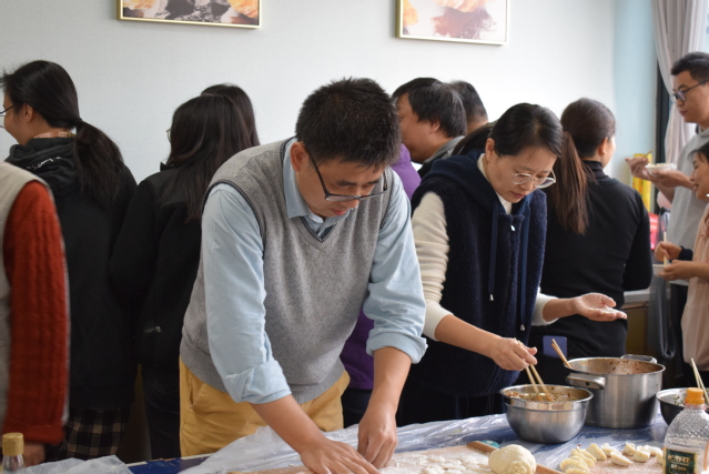 活动现场,老师们分工明确,配合默契,忙得不亦乐乎。有的老师手法娴熟地擀着饺子皮,一张张薄厚均匀的面皮在他们手中快速旋转;有的老师专注于揪面团,大小均匀的面团排列整齐;还有的老师则大显身手包着饺子馅,或捏出精致的褶子,或包出独特的形状,一排排独具个性的饺子很快摆满了餐盘,每一个饺子都饱含着老师们的欢乐与创意。整个过程中,大家相互交流包饺子的技巧,互帮互学,在协作中感受着冬日里的融融温情,现场气氛热闹非凡。